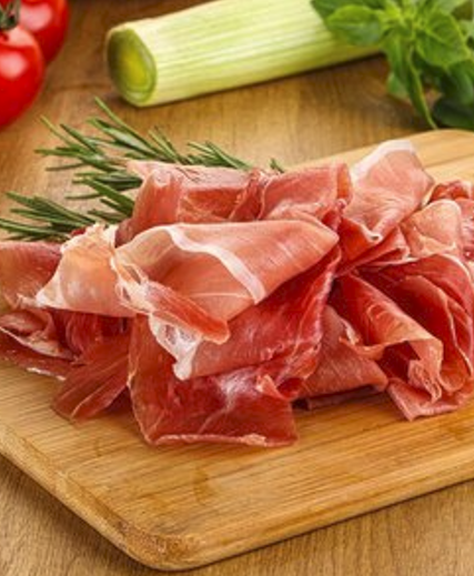 Die Rinde bleibt dabei unberührt, was den Schinken besonders saftig und aromatisch macht. Parmaschinken wird typischerweise in sehr dünne Scheiben geschnitten und als Vorspeise serviert, oft in Kombination mit Melone oder feinem Brot. Er ist auch eine wichtige Zutat in vielen italienischen Gerichten wie Pasta oder auf Pizza.